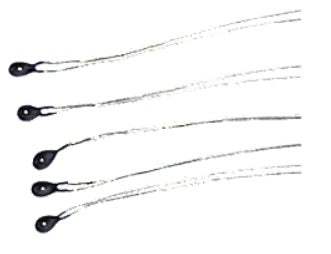 The Keysight 34308A thermistor kit contains five 10k Ohm at 25 degrees C thermistors, epoxy encapsulated with bead construction. The operating temperature range is 0 degrees C to 75 degrees C, with 0.1 degrees C interchangeability. The 34308A is recommended for high accuracy, high sensitivity temperature measurements and for calibration of the Keysight 34970A multiplexer modules.