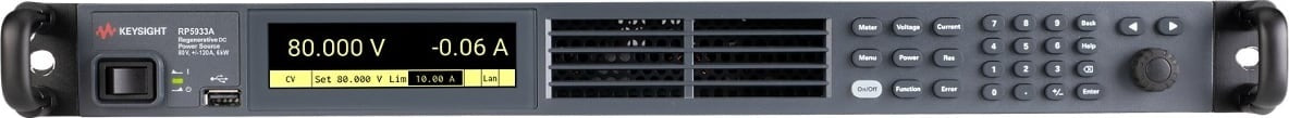The Keysight RP5900 Series of midrange, bidirectional DC power supplies feature integrated electronic load capability. These single-output, programmable power supplies are available in compact 1U and 2U sizes, with output power ranging from 2 kW to 12 kW. With regenerative capabilities, they efficiently return the energy they consume to the grid, reducing energy costs and minimizing cooling needs. The integrated electronic load capability also contributes to cost and space savings and reduces integration time that would otherwise be necessary.