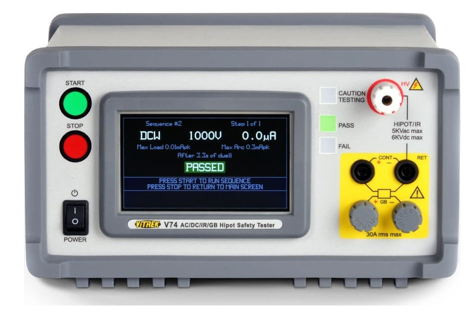 AC/DC/IR Scanning Hipot Tester with Ground Bond Test. 2500VAC/2750VDC/IR/Continuity Electrical Safety tester with built-in switching for up to 8 channels of HV, 8 channels of return, and 8 channels of continuity. Ground Bond is available on the front panel only. Comes with: TL-209, Power Cord, Operating Manual, QTPro-7 45 Day Free Trial, NIST Traceable calibration certificate without data. ISO 17025 accredited calibration certificate with data and uncertainties available with purchase at a reduced price with part number: ISO-CALN-V7X.